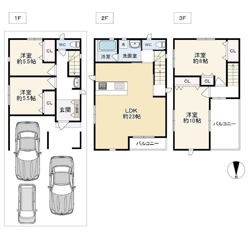 ●間口約6.4m・3台駐車可能(車種による)の広々スペースは自転車やバイクもラクラク置ける
