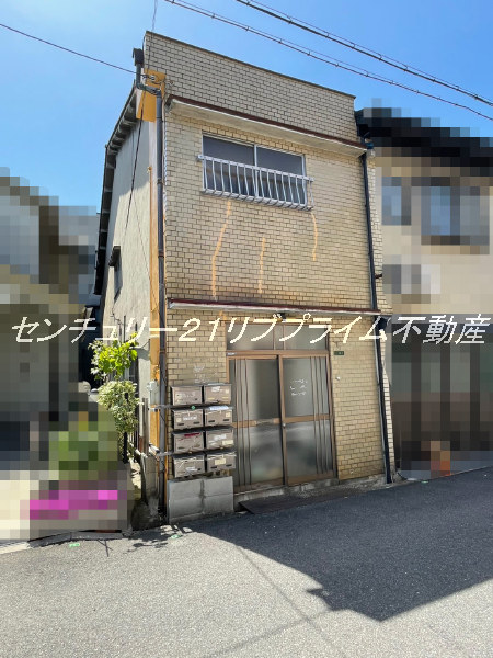 外壁はタイル調ながら経年による汚れがあり、リフォーム前提で自由なアレンジが可能。複数の郵便受けが設置されているため、事務所やシェアハウス利用にも最適です。